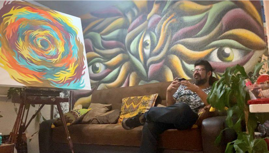 Pintor del Estado de México, nacido el 23 de agosto de 1987, realizó estudios de arquitectura, sin embargo, renuncio a esta carrera para adentrarse al mundo del arte derivado de una revelación a través de la magia de las plantas sagradas, en la búsqueda de autoconocimiento, su arte nace desde el interior de las experiencias vividas y sus constantes viajes, que le permiten transmitir sus sensaciones mediante trazos en sus lienzos con la técnica en acrílico, describe las historias con una paleta de colores básicos pero detalla una especie de misticismo simbólico sin que necesariamente se entable una expresión religiosa, sino una red de historias personales que comparten algo en común, la reciprocidad, el colaboracionismo, la solidaridad y el saber que las cosas son como debieron suceder, sin idealismos y consciente que la vida sigue transcurriendo y que el arte que realiza se forma sin la necesidad de ser reflexionada o pensada, es en realidad el resultado de fuentes emanadas de un todo donde él es el canalizador que estampa con trazos de una geometría sagrada compartida y contenida por todos.