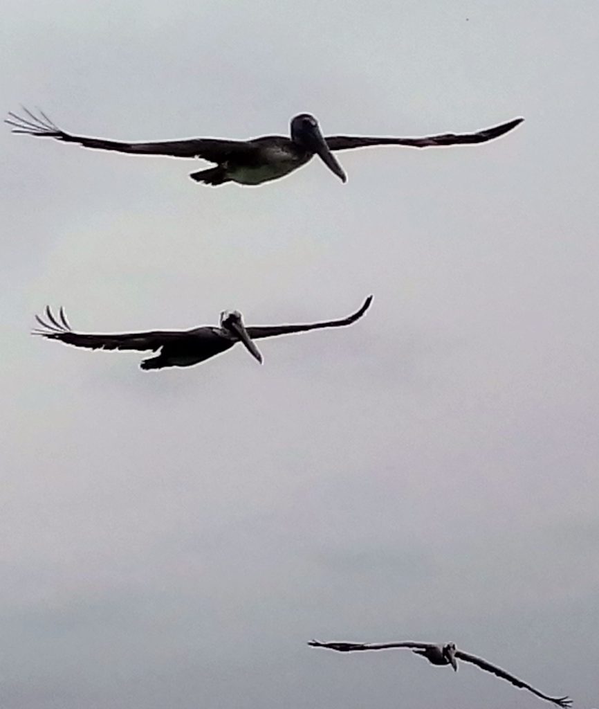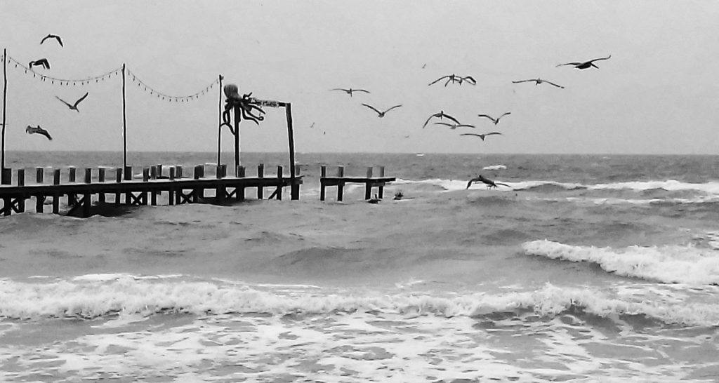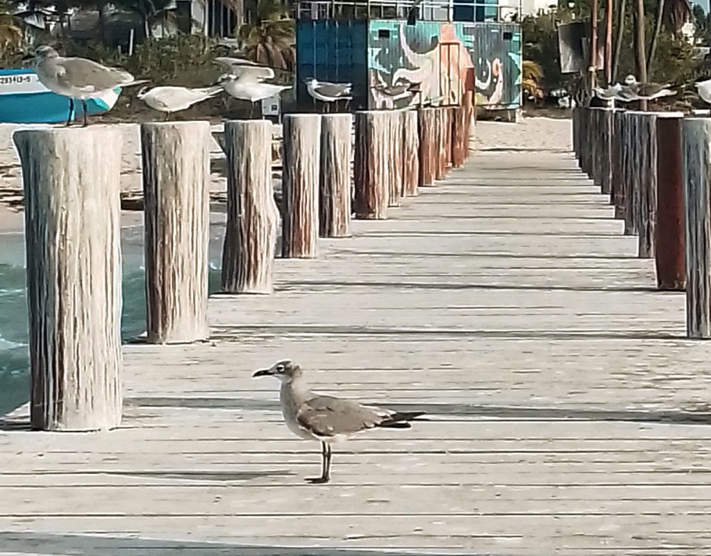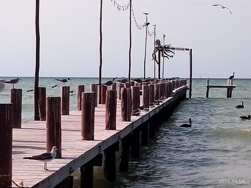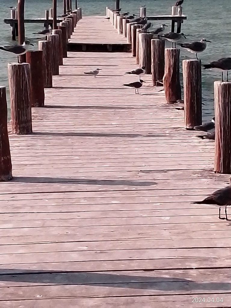 en un largo muelle los pelícanos vigilan